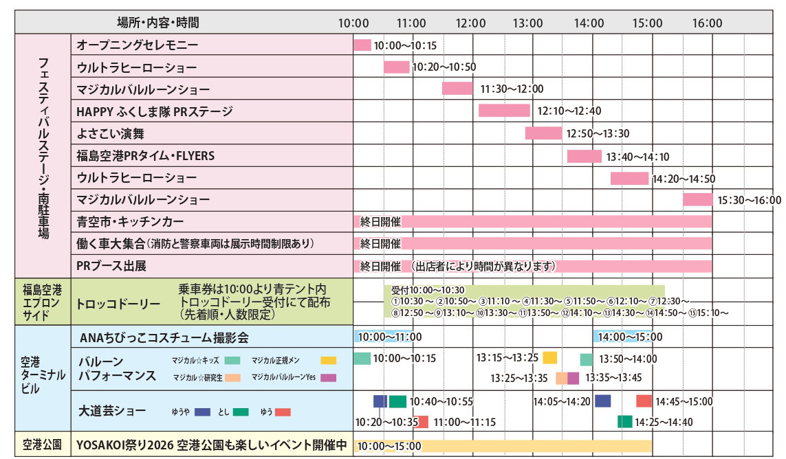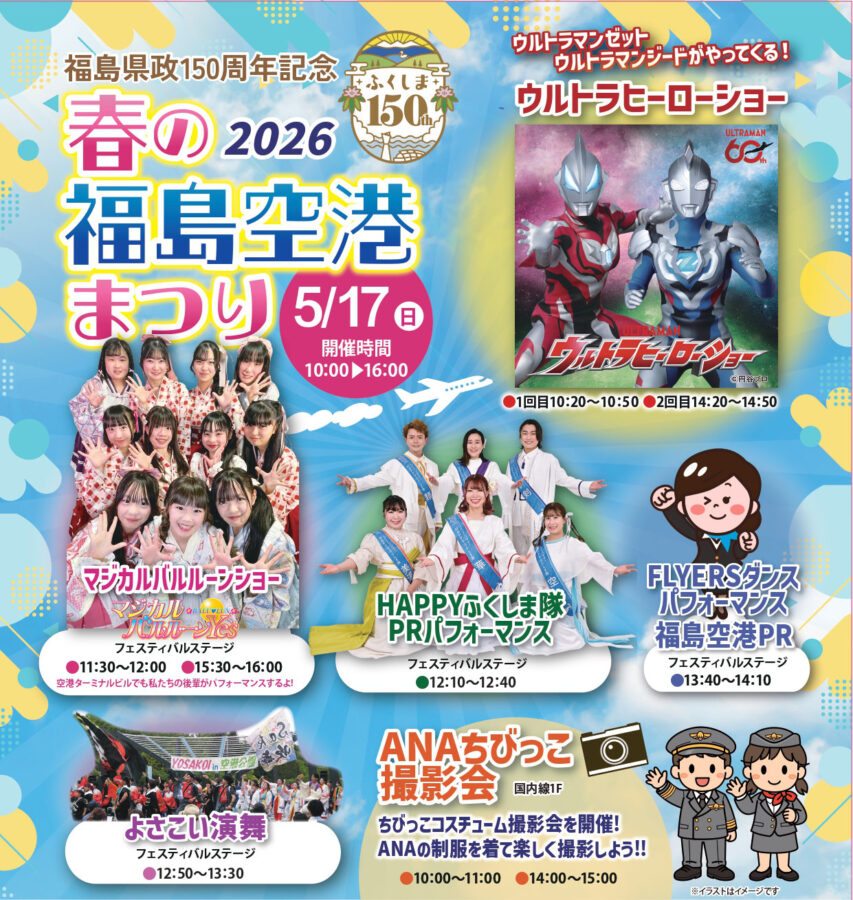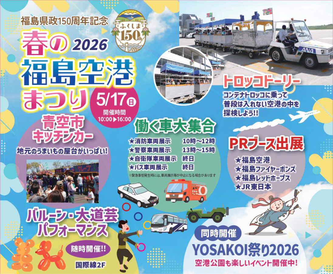春の福島空港まつり2026 5月17日(日)10:00~16:00開催お問い合わせ:(株)福島エアポートサービス0247-57-1650 春の空港まつり2026チラシPDF 北駐車場、空港公園駐車場、仮設南駐車場をご利用ください。 おすすめ 台湾フェア 2023年12月27日 2026ふくしまサマーニットフェア 2026年4月8日 第5回サボテン多肉植物ソラフェア 2026年3月2日