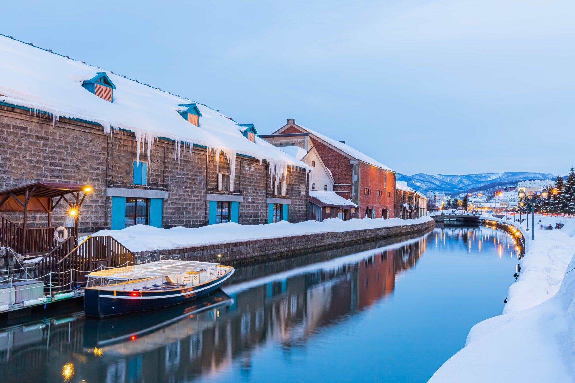 大正12年完成の歴史ある運河。散策路には63基のガス灯が並び、夕暮れ時には石造倉庫群を照らして幻想的な雰囲気を演出します。運河沿いには当時の面影を残す建物が立ち並び、レトロな港町の風情を今に伝えています。冬の雪景色も格別です。