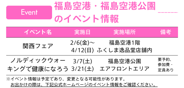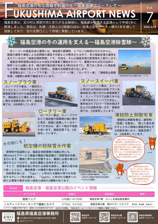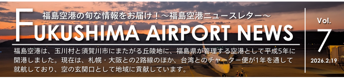 Fukushima Airport News Vol.7 おすすめ 手荷物専用コンテナの取り扱い終了 2026年1月27日 韓国清州-福島空港チャーター便の運航 2026年2月21日 お得に台湾:パスポート補助と30歳未満1万円値引き 2024年12月7日