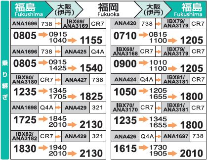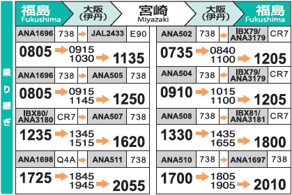 鹿児島→福島の最終便は乗継時間が30分なので、リスク回避のためには、1本前または宮崎を使うのも一案かと思います。