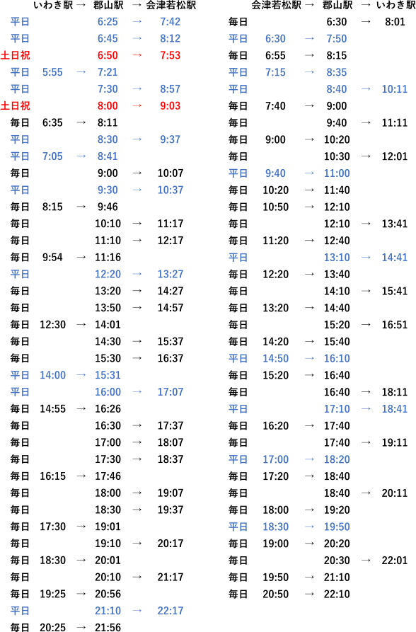会津若松・いわき行き高速バス時刻表・・・郡山駅でお乗り換えください