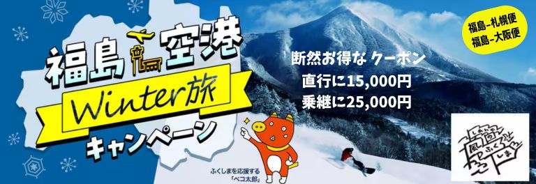 福島-大阪、福島-札幌に15000円、大阪・札幌経由の乗継に25000円のクーポン進呈。乗継キャッシュバックと併用可