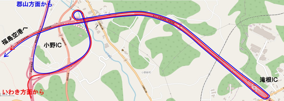 小野ICから滝根ICへ向かい戻ると往復4.7kmの無駄走りになります。いわき市平から空港に向かう場合は、国道49号経由で平田ICを経由すると、ほぼ同じ時間で(磐越道料金もかからずに)福島空港に来ることができます。