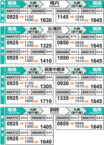 直行便がなくても、大阪・札幌の空港を経由して飛行機を乗り継ぐことで、沖縄・九州・四国などに行くことが出来ます。チェックインは出発空港でまとめて行います。荷物を預け入れるときは、乗り継ぐ空港で預け入れ荷物を乗り継ぎ先の空港まで運ぶように(1泊して乗り継ぐときは逆に乗継空港で降ろすように)出発空港のチェックインカウンターで指示してください。(→詳しくはQ&A)。