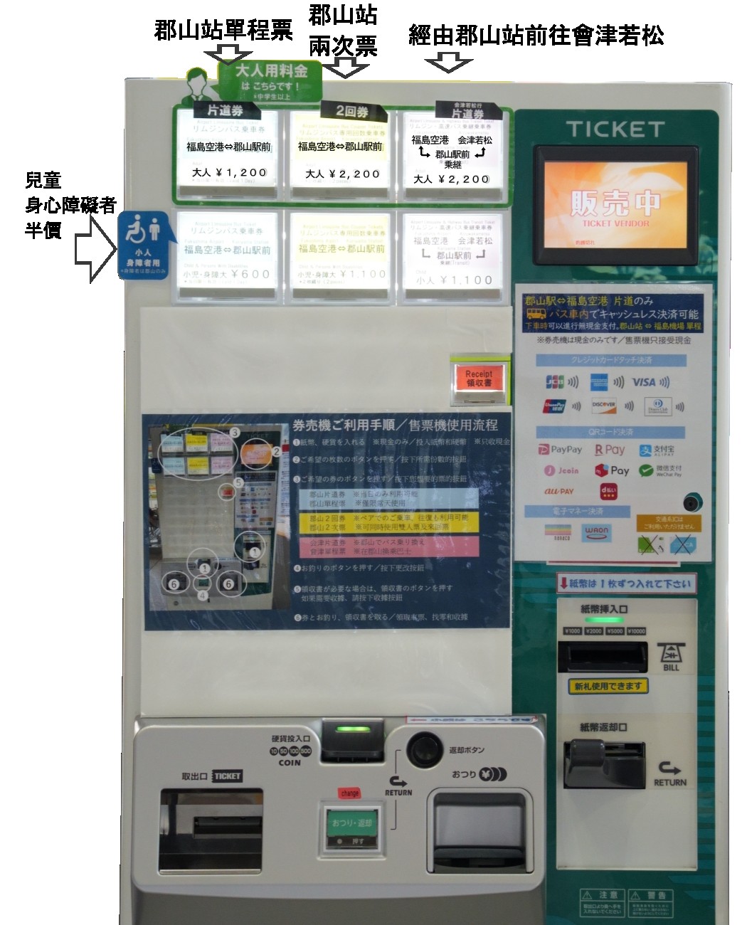 郡山車站的巴士售票處很小,所以需要排隊等候。 下車時最好用現金支付。您也可以使用 PayPay、ALIPAY 和 VISA/Amex/JCB/銀聯/Diners/Discover Touch 付款。