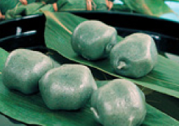 粒あん入りのよもぎだんごを天然の隈笹で包んだ和菓子。